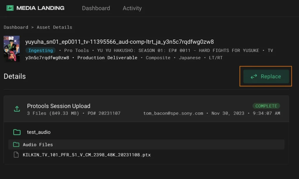 An asset can be replaced after upload once the placeholder status has changed to “Ingesting” and the Replace button becomes active.