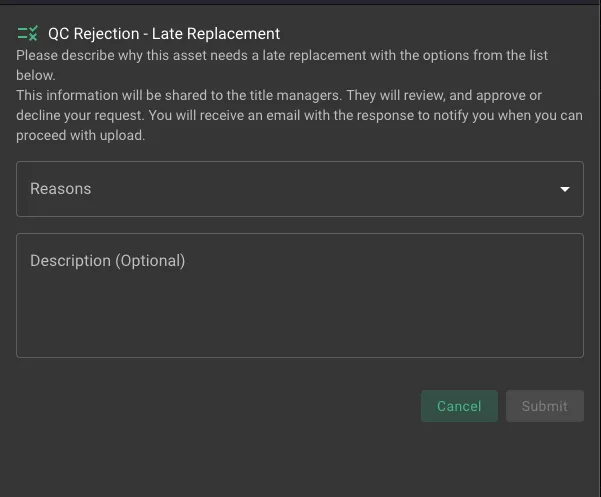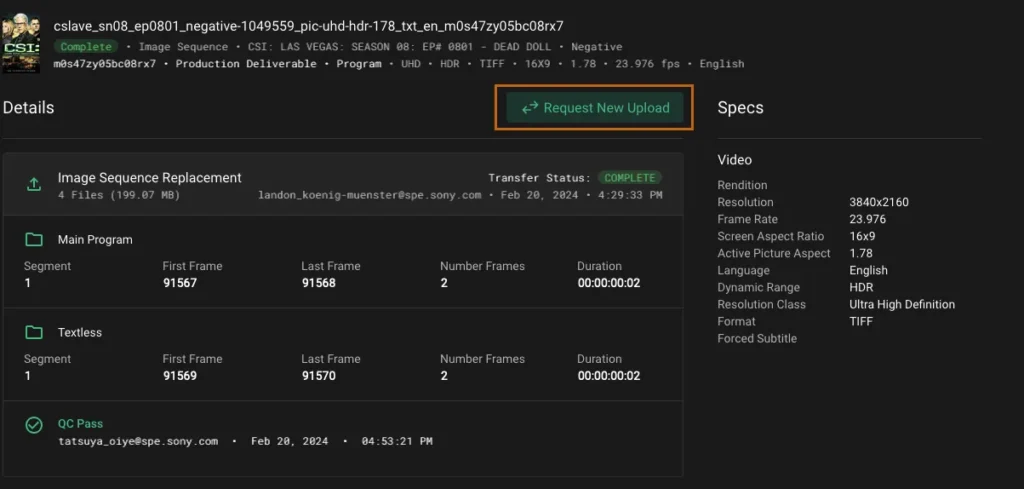 For an image sequence, you’ll need to click “Request New Upload” and note the reason for the replacement. Your SPE contact will approve the request and the placeholder will be available for fulfillment.