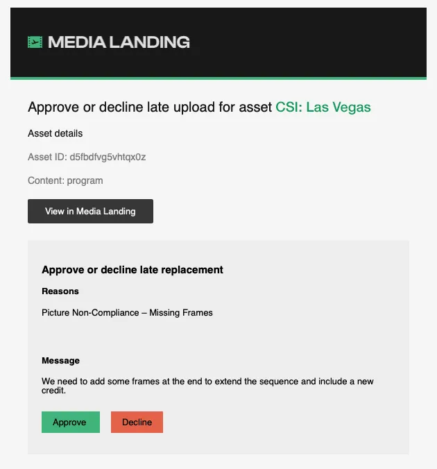 Note that when using the “Replace” and “Request New Upload” functions all previous uploads of an asset are retained in Media Landing until the asset is finalized.