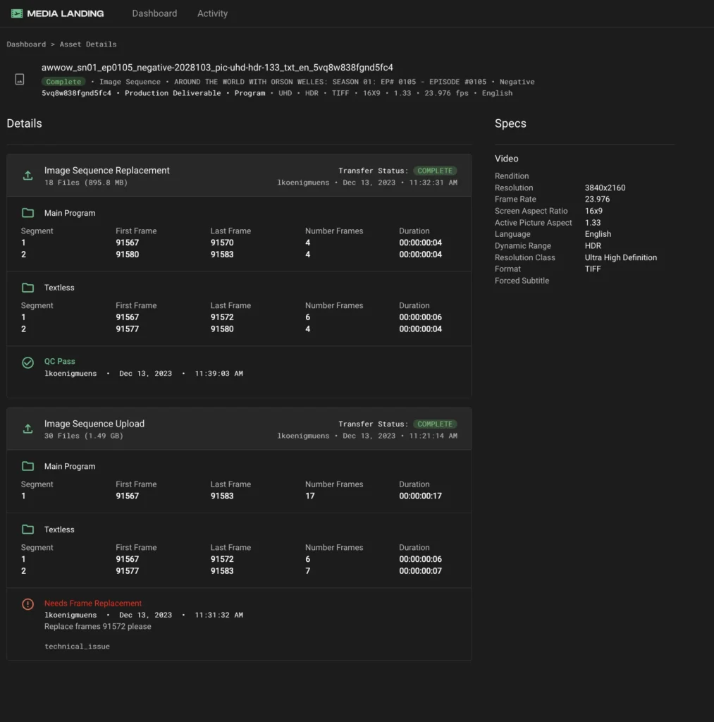 Note that all previous uploads of an asset are retained in Media Landing until and asset is finalized.