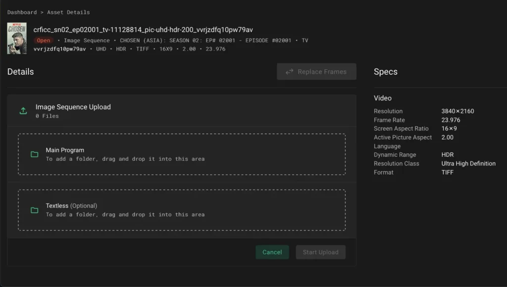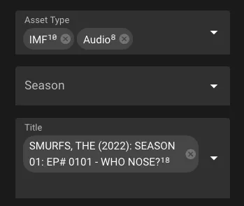By clicking on a Filter and selecting a value, you can constrain the Placeholders displayed in the Results pane. In this example the results are constrained to the asset type IMF. They are then further constrained using the Language filter and then selecting German.