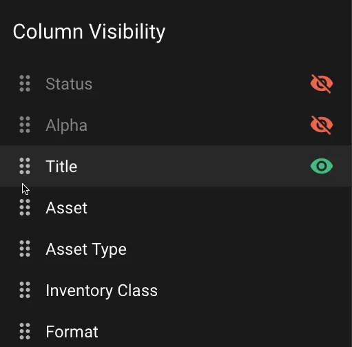 To hide a column, click the Column Visibility button. Hover to the right of the column name and click the green eye icon for columns you would like to hide. You can also re-order columns by dragging the control on the left of the column label.